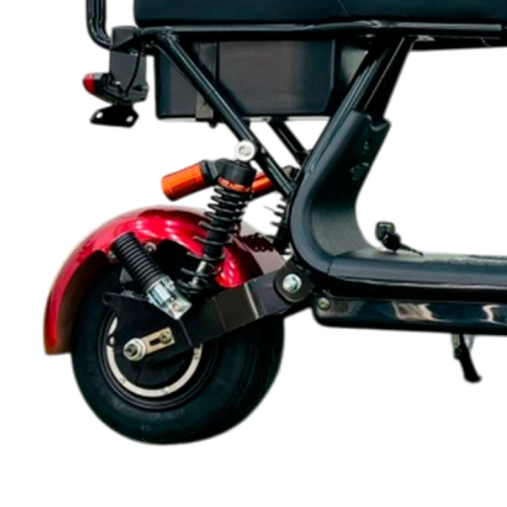 Электроскутер предназначен для 2-х ездоков, один из которых пассажир. Комфорт езды на дальние расстояния обеспечены анатомическим сиденьем. Пассажирское оснащено мягкой спинкой. Материал изготовления вместе с амортизаторами гарантируют отсутствие усталости при езде на продолжительные расстояния. Широкая прорезиненная платформа для ног не скользит, не провоцирует дискомфорта.
