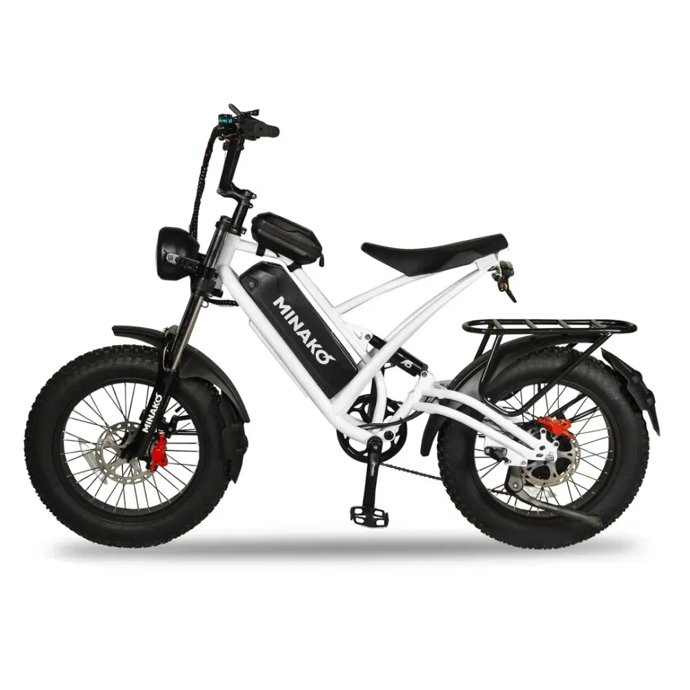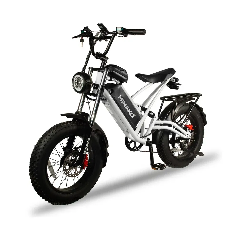 Электровелосипед Minako FOX (23Ah) Белый Спицы - это эпитомия элегантности, силы и инноваций. С максимальной скоростью 55 км/ч и мощным 1000W двигателем, он обеспечивает беспрецедентную производительность. Его необычный дизайн, напоминающий питбайк, в сочетании с мотоциклетной вилкой, создает неповторимый облик. 20-дюймовые колеса с большими внедорожными покрышками обеспечивают уверенность на любой поверхности. Гидравлические дисковые тормоза гарантируют безопасность, а пробег в 60 км на одном заряде 23Ah аккумулятора обеспечивает долгую эксплуатацию. Дополнительные удобства включают большую фару, небольшую сумку спереди и багажник сзади, который может служить местом для пассажира.